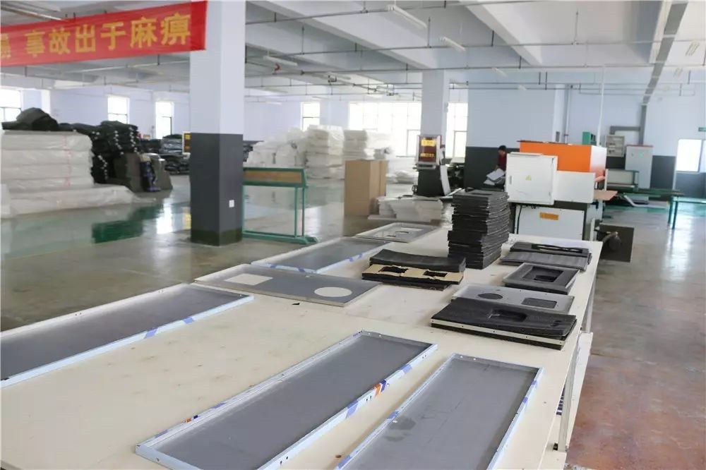 泡棉加工车间位于湿腾电器山东工厂园区19号楼的2楼。泡棉加工区内有保温棉下料机和冲压机泡设备,适用于各种保温棉下料。