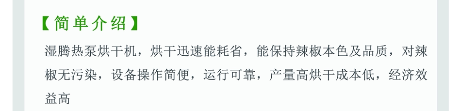 辣椒原料含水率很高,一般为75%-85%,为保证烘干后辣椒营养成分不受影响的情况下提高生产率,烘辣椒的最佳温度取60-80℃为益。传统风干工艺满已足不了现代化工业生产要求。主要是受季节限制,环境条件(温湿度环境)限制,卫生条件限制等。湿腾空气能热泵烘干机,节能、环保、耗能低,品质高,替代了传统的晾晒模式,不受季节影响,可实现批量工业化生产需求,工艺可控,设备无需专人值守。