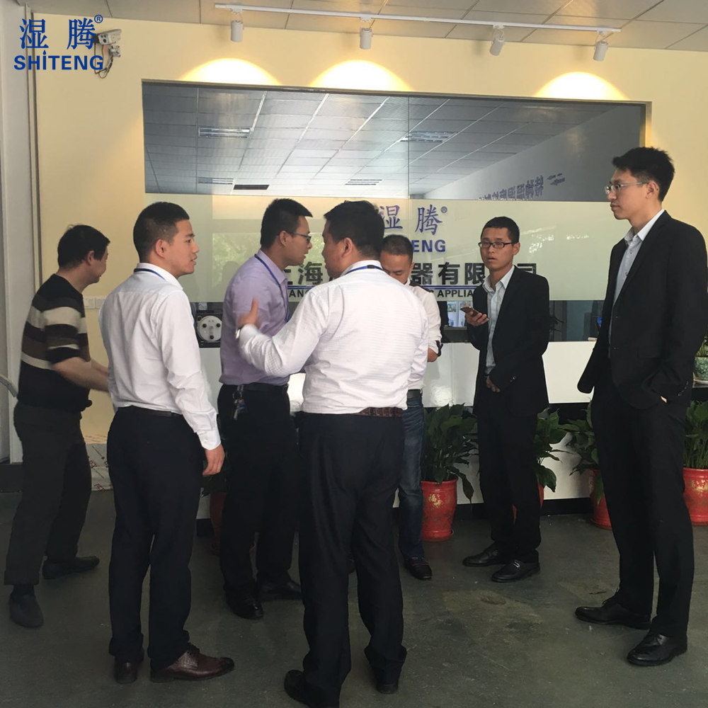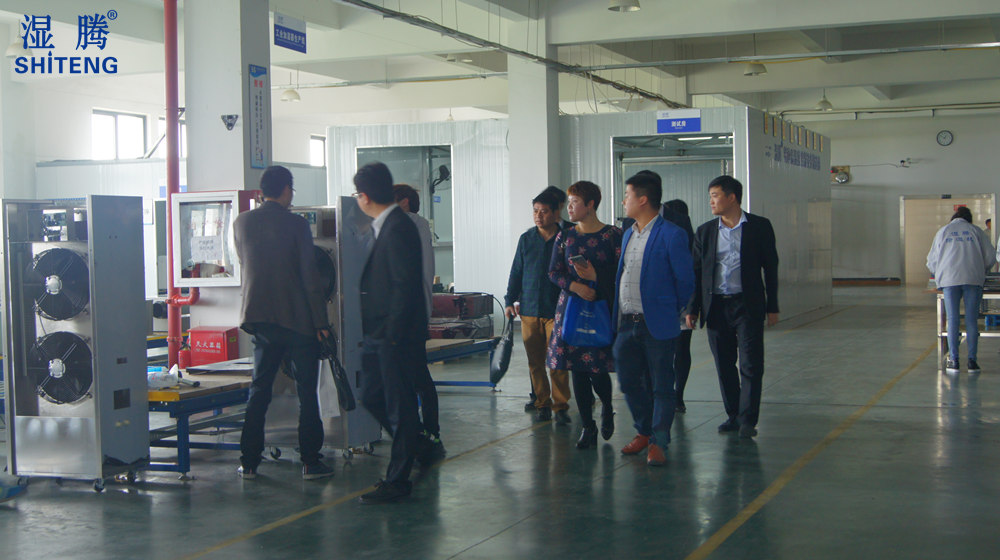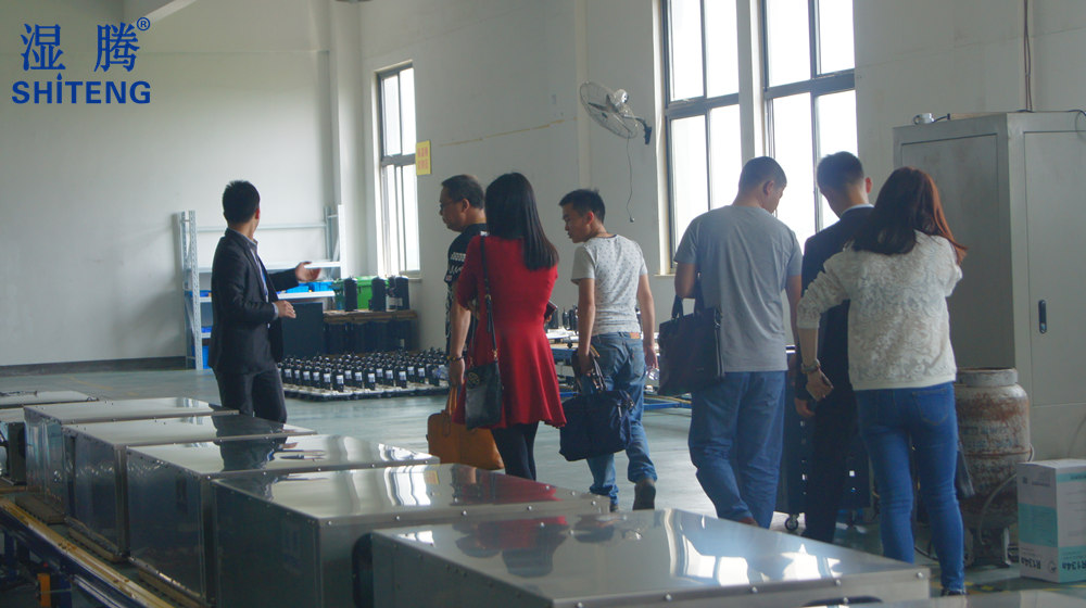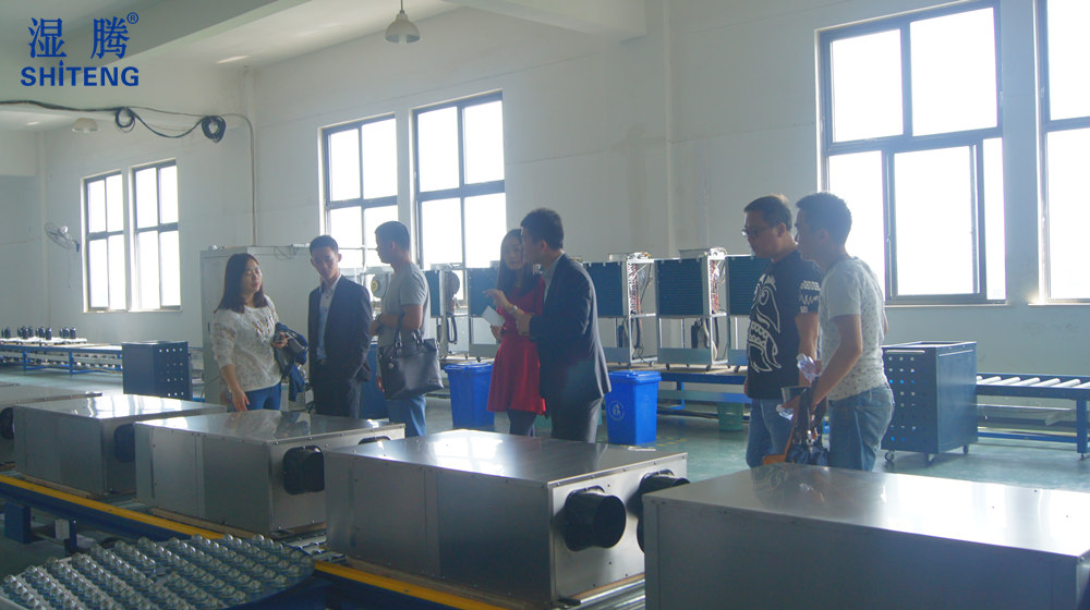 湿腾工作人员陪同各位来宾参观我司工厂 中央新风除湿机车间